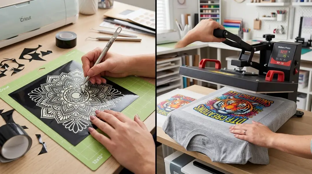 HTV is a polyurethane-based material that comes in solid-colored rolls. Using a digital cutter like a Cricut or Silhouette, you cut your design into the vinyl, remove the excess material (weeding), and use a heat press to bond it to the garment. It is a layering-based process where each color in your design requires a separate layer of material.
